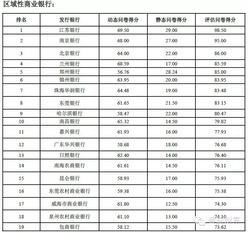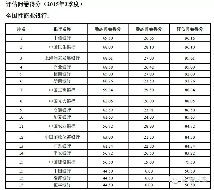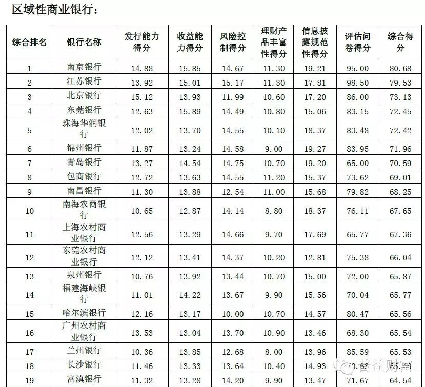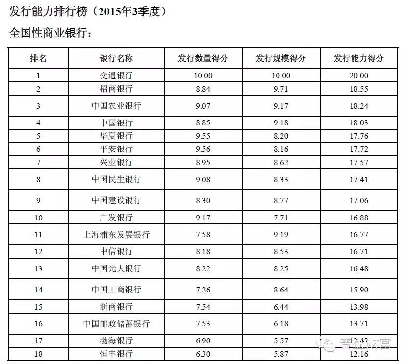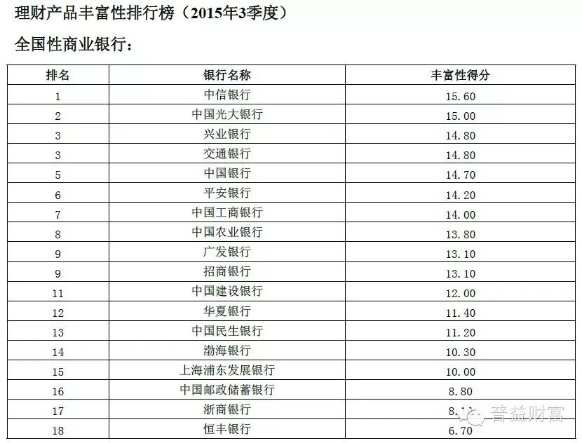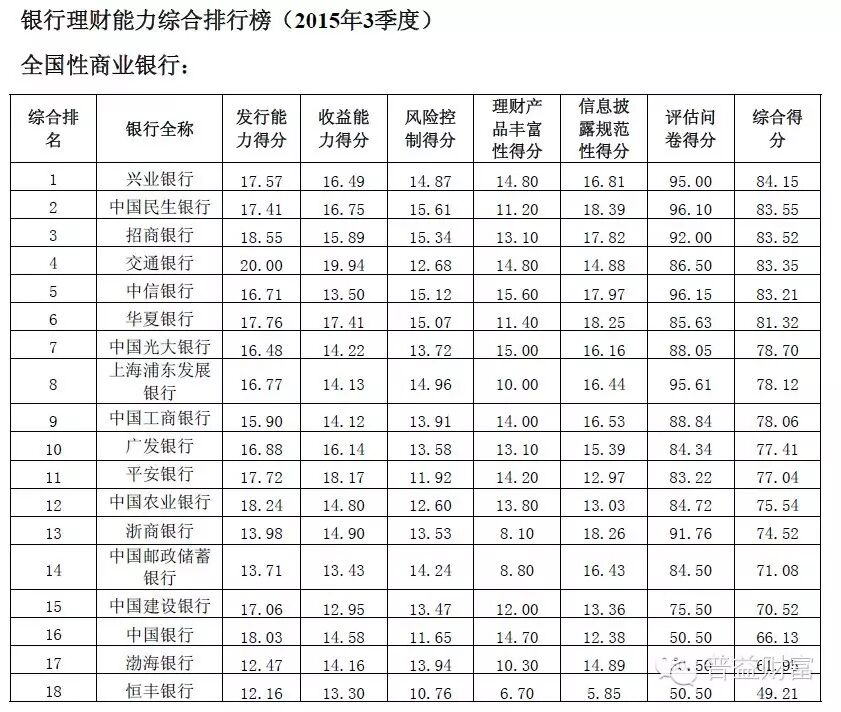综合理财能力:兴业、民生、招商居全国性银行前三,南京、江苏、北京居区域性银行前三 全国性银行综合排名前十强依然是股份制商业银行占据绝大多数席位,其中有8家为股份制商业银行,2家为国有银行。国有银行得益于网点数量庞大,所以在理财产品的发行规模有相对的优势,但是其在产品收益定价水平、产品的风险控制以及信息披露规范性等方面的表现较大多数股份制银行及少部分大型城商行偏弱。因此综合理财能力排名中,国有银行名次略为靠后。不过,国有银行中,交通排名全国性银行第四,其发行能力与收益能力均极为突出。 分类指标测度 发行能力:交行、招行、农行居全国性银行前三,北京、南京、江苏银行居区域性银行前三 从投资类型来看,全国性商业银行理财产品主要为组合投资类理财产品和债券与货币市场类理财产品,发行数量分别为6624款与6236款,两者共占71.87%。在各银行中,华夏银行的债券与货币市场类产品发行数量最多,为1412款,紧随其后的是兴业银行、中国银行和平安银行;招商银行的组合投资类产品发行数量最多,为1000款,发行该类产品超过500款的还有广发银行、民生银行;结构性产品的发行数量为3891款,占比为21.75%,发行该类产品最多的农业银行和民生银行分别发行了752款和535款。 全国性商业银行发行规模估测约为26.87万亿。其中,国有银行发行规模估测约为13.62万亿;股份制商业银行发行规模估测约为13.25万亿。 区域性商业银行发行规模估测约为1.98万亿。其中,城市商业银行的估测发行规模在区域性商业银行中占比约为73.17%,较上期下降1.42个百分点。 收益能力:交通银行、平安银行、华夏银行居全国性银行前三,东莞银行、南京银行位居区域性银行前二名 本季度大部分银行理财产品的EI值环比上升,但是上升原因并非是由于其绝对收益率上升,而是因为EI值的计算以同期存款利率作为参照物,二季度存款基准利率大幅降低,致使银行理财产品的平均EI值上升较大。 全国性商业银行发行的理财产品中,共有10930款公布了预期收益率,平均EI值为2.8075。在纳入排名的银行中,浙商银行产品平均EI值为3.2103,在全国性商业银行中最高,但其发行数量仅为371款,在发行产品数量上不占优势,因此该行在全国性商业银行的收益能力排名中位居第八。交通银行收益能力排名第一,其平均EI为2.9443,高于平均EI值,但其发行量为2804款,两方面综合原因促使其在收益能力上位居第一。 区域性商业银行发行的理财产品产品中,共有14372款公布了预期收益率, 平均EI值为2.9455。在纳入排名的银行中,东莞银行收益能力位居首位,其平均EI值为3.7870,在区域性商业银行中排名第三,由于其发行数量超过250款,因此收益能力排名第一。南京银行发行产品超过800款,在区域性商业银行中发行数量最多,且其平均EI为3.0836,高于平均水平,因此收益能力排名第二。 风险控制能力:民生银行、招商银行、中信银行居全国性银行前三,江苏银行、青岛银行、南京银行居区域性银行前三 全国性商业银行中,民生银行、交通银行、华夏银行、中国银行和兴业银行在实现预期收益率的产品数量方面表现优秀,这些银行公布的实现了预期收益率的固定收益类产品数量均超过800款,显著超过其他银行。民生银行2015年3季度公布的实现了预期收益率的固定收益类产品数量达到874款,实现了预期最高收益率的结构性产品数量达到872款,远超多数全国性商业银行,再加上该行在收益实现能力方面表现突出,因而在全国性商业银行中位列风控能力第一位。 理财产品丰富性:中信银行、光大银行、兴业银行居全国性银行前三,杭州银行、江苏银行、南京银行居区域性银行前三 排名靠前的全国性商业银行在收益类型、投资币种、投资对象、投资期限、投资起点共五个子项目中的至少三个上都有较为突出的表现。中信银行在2015年3季度位列理财产品丰富性第一位,该行在收益类型、投资币种、投资对象和投资起点类型上所得分数均较高。光大银行紧随其后排名第2位,该行在收益类型、投资对象、投资币种、投资期限4个子项目上取得了与中信银行同样的得分,仅在投资起点得分上落后于中信银行。 信息披露规范性:民生银行、浙商银行、华夏银行居全国性银行前三,苏州银行、锦州银行、南京银行居区域性银行前三 整体来看,全国性商业银行在信息披露方面的表现仍然不及部分优秀的区域性商业银行,从排名前18位的区域性商业银行与全国性商业银行的比较可以看出,全国性商业银行在发行、到期和运行信息三个子项上的平均得分均低于排名前18位的区域性商业银行,尤其是运行信息平均得分的差距达1.5分(此子项满分为5分),相比于第2季度的1.47分,此项差距继续扩大。 评估问卷测度 2015年第3季度银行理财能力排名的评估问卷测度包括动态调查问卷和静态调查问卷,卷面总分100分,其中动态调查问卷30分,静态调查问卷70分。对本季度未返回问卷的银行给予50.50基础分。