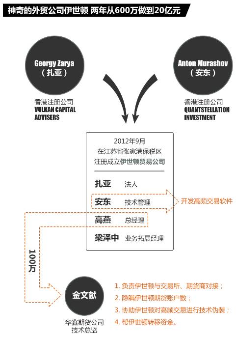 拥有外资背景的外贸公司伊世顿通过高频交易软件,将600万元的资本做到20亿元,其总经理高燕、业务拓展经理梁泽中,及相关联系人华鑫期货公司技术总监金文献均被依法逮捕。