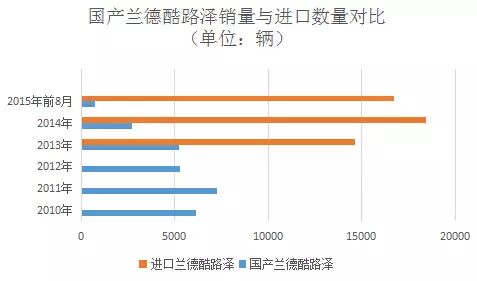 国产兰德酷路泽的光景也同样惨淡。2010年至2013年,一汽丰田兰德酷路泽的年销量均能在5000至7000辆之间,但是到了2014年,其年销量仅仅实现2760辆;2015年即将结束,其1-8月累计销量只有775辆(据乘联会数据)。不在一个量级的是,兰德酷路泽2013年进口数量为14653辆,2014年达18451辆;2015年1-8月累计进口量已经实现16768辆,是国产车型的22倍。