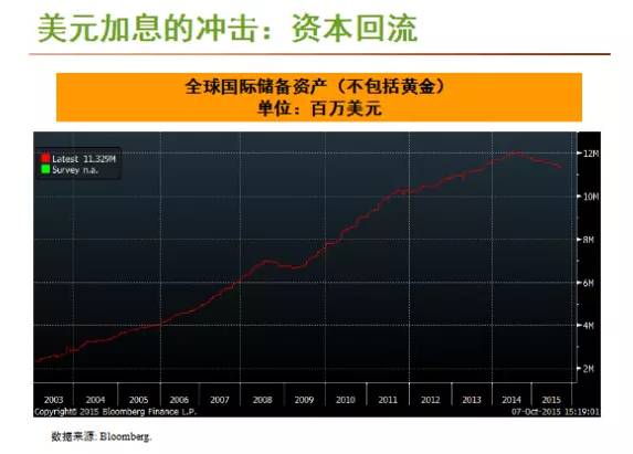 昨天晚上非农业就业数据非常好,远远超过预期。9月份的时候市场暴跌以后,大家预期12月份加息的概率只有32%,到昨天晚上看这个市场预期已经是75%了,有人就说了,12月份加息是100%的。那好了,加息有什么影响呢?刚才我说了,这个商品大牛市期间,大家这个融资是哪儿来的?很廉价的融资,大量的QE放了很多钱出来,现在是什么呢?美元利息要上来了,资金在回流。而说这个事不是吓唬大家,已经开始了,没加息就已经开始了,因为什么?从什么时候开始的?从美国的量宽政策(QE)开始减规模,资本就已经在回流了。