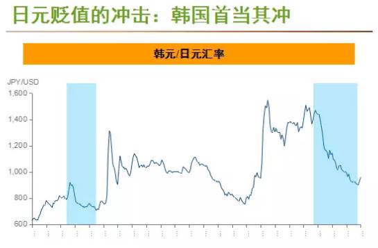 美元升值了,什么贬值了?别的货币贬值,日元、欧元不怕贬值,它贬贬的很凶,发达国家不敢的,会引发债务问题,结果是什么?日元贬值远远超过其他的新兴市场经济体的贬值,使得相对竞争力,尤其是韩国、台湾,包括中国,我们的相对竞争力跟日本来比就坏了很多。98年的时候就遇到了这个情况,日元大幅度的贬值,后来把亚洲也拖的够呛,你要想这个经济体系非常复杂的一个东西,开始的一个东西我们要注意,后面会不停地加,这是其中的一个正反。