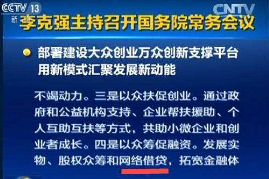 李克强总理在会议上指出,要发展股权众筹和网络借贷,有效拓宽金融体系服务创业创新的新渠道新功能。
