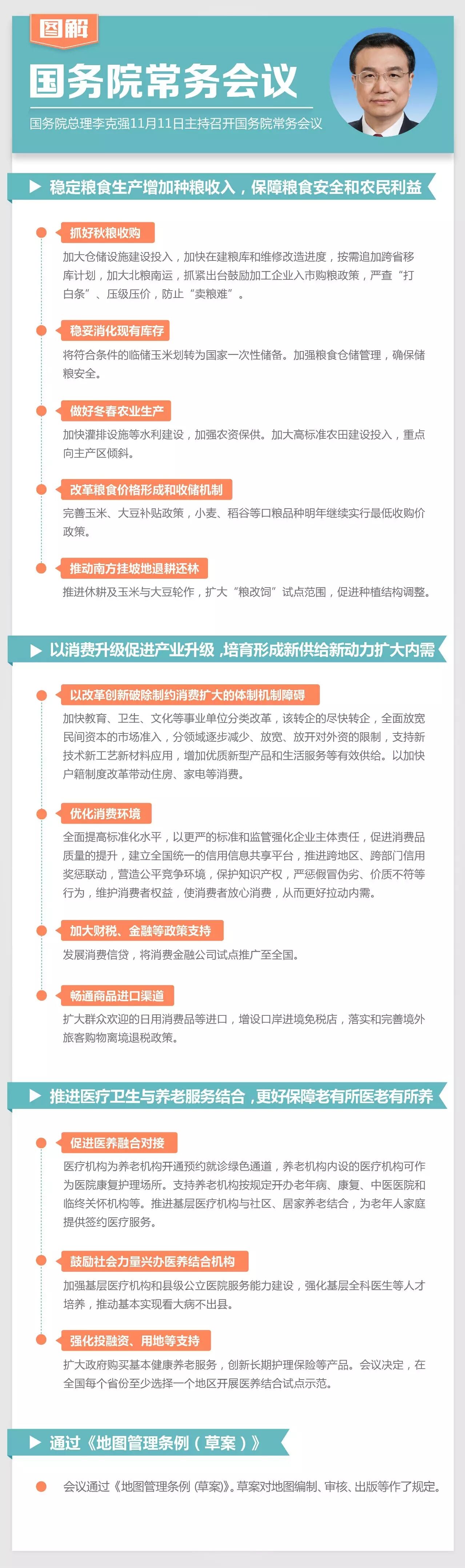 国务院总理李克强11月11日主持召开国务院常务会议,确定稳定粮食生产增加种粮收入的措施,保障粮食安全和农民利益;部署以消费升级促进产业升级,培育形成新供给新动力扩大内需;决定推进医疗卫生与养老服务结合,更好保障老有所医老有所养;通过《地图管理条例(草案)》。