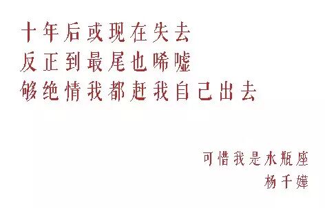 事后,陈奕迅被问此事时假装生气不承认有爱过,杨千嬅则坦荡地大笑,“不是我比他勇敢,只是我比他更‘三八’!”其实,杨千嬅并不三八,她只是更豁达勇敢,她就像她唱的: