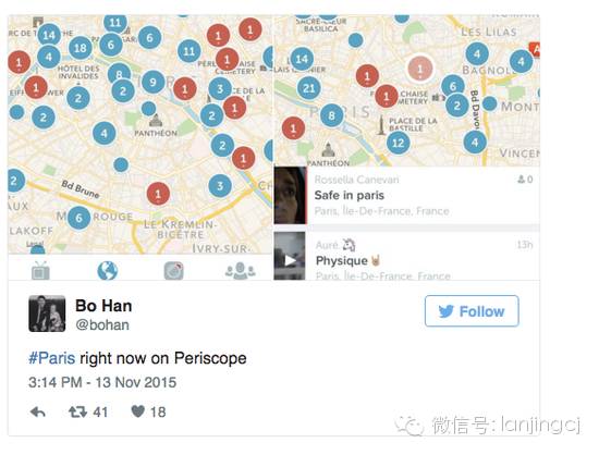 Twitter收购的视频直播软件Periscope成为人们了解巴黎事态的第一“前线”。在袭击发生后,Periscope上面到处都是巴黎地区的视频信息流,人们通过直播自己周边的情况,让更多的人了解到事态。