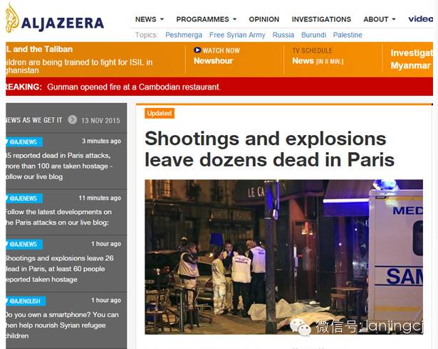 半岛电视台网站的标题是:巴黎发生的枪击和爆炸导致数十人死亡,也将焦点置于事件的进展当中。