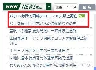 在滚动新闻中,NHK对巴黎遭受袭击事件给予了两篇报道:分别是巴黎受袭死亡人数至少120人和巴黎受袭,多名日本游客取消赴法计划。