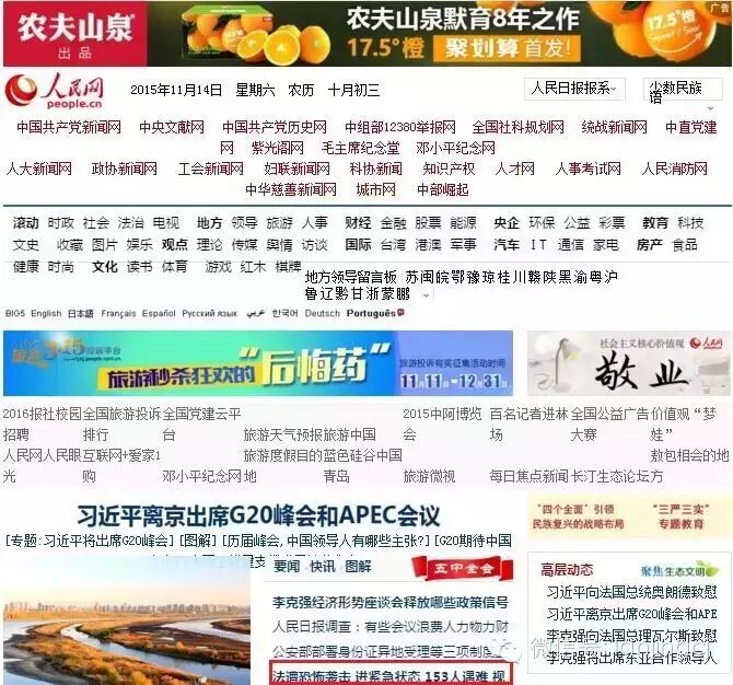 相对其他网站,人民网对巴黎受袭,无论是在网站上的重要性,还是关注度,都低了些。人民网首页将坠机事故新闻放在了习近平出席G20峰会新闻的下面,且是第四栏。但在首页轮播图上,第一幅就是法国系列枪击爆炸事件已致150多人死亡的图解。
