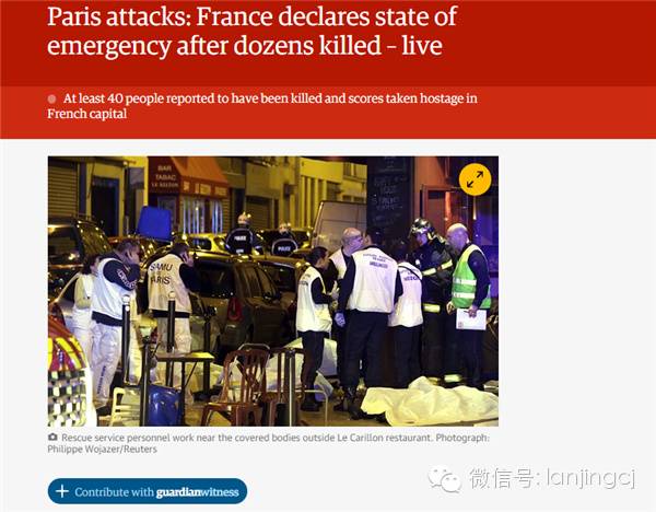 英国《卫报》的标题:法国将宣布全国进入紧急状态。报纸大图刊载了袭击现场附近人员的急救现场。