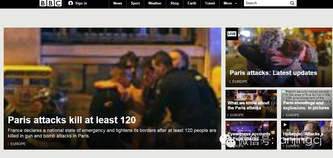 BBC官网首页都是法国巴黎受袭击的新闻,不仅开通了网上直播迅速传播信息,还用视频、图片、文字等形式多方面报道。