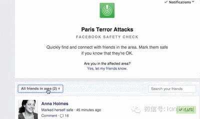 Facebook作为社交媒体,第一时间利用社交优势启动了安全签到功能,如果它检测到用户在爆炸或者枪击发生的地方,系统就会自动发私信确认你的安全状态,而用户一旦在Facebook上表明自己无恙,他在Facebook上的好友都会收到消息推送;而且Facebook还可以让他们询问其他朋友,或者代替他人报平安。