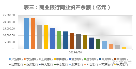 从上表二也不难发现,信贷资产环比增长较快的还是城市商业银行以及部分股份制银行。包括工商银行在内的五大国有商业银行则明显受制于信贷需求不足,增速缓慢。与上述信贷资产的增速缓慢形成鲜明对比的则是包括兴业银行在内的多家商业银行同业资产增速迅猛。界面新闻统计了截止三季度末,A股上市商业银行同业资产的信息,其金额累计达186,266.67亿元,约占上市商业银行信贷资产余额的32.04%。表三列示了截止三季度末商业银行同业资产的余额信息。