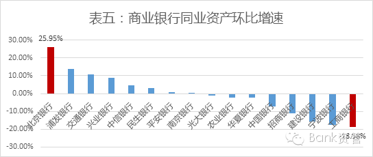 从季度环比数据来看,商业银行增速高低不一。增速最快是北京银行,环比增长25.95%,而最慢的工商银行则出现了18.58%的负增长。同业大王兴业银行依然位居较前的位置,环比增速8.82%。
