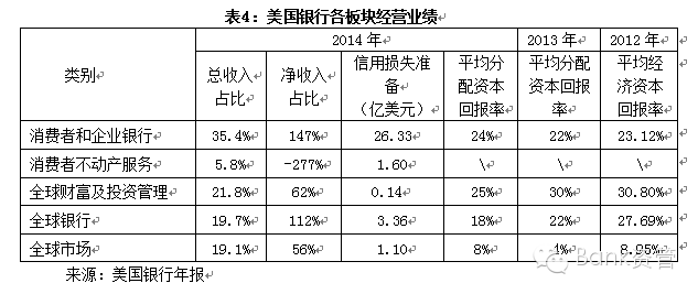 美国银行2006-2008年划分为三大业务板块:全球消费者和小企业银行、全球公司和投资银行、全球财富及投资管理。2009年分为六大业务板块:存款、全球卡服务、住房贷款和保险、全球银行、全球市场、全球财富及投资管理。2012年调整为五大主要业务板块,一直到2014年仍是如此:消费者和企业银行(CBB)、消费者不动产服务(CRES)、全球财富及投资管理(GWIM)、全球银行(GB)、全球市场(GM)。2014年GWIM板块的的收入(184亿美元,创历史新高)和净收入(29.74亿美元)分别占全行的22%和62%(净收入占比高是因为CRES板块亏损)。从2012到2014年,GWIM板块都是资本回报率最高的板块。