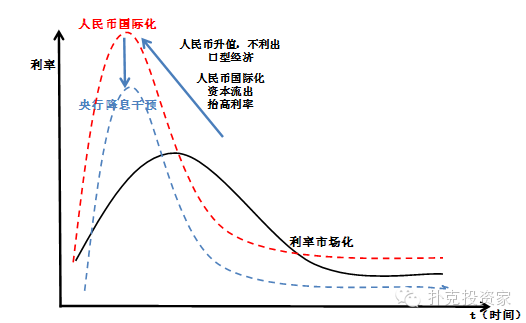 人民币国际化将分流部分流动性,短期加大央行的宽松力度,长期倒逼利率市场化改革,利率下行。人民币国际化的推行会导致人民币资本流出,流动性受到影响。在当前经济形势下,人民币资本的流出,会加大央行的宽松预期。人民币国际化将加大利率的波动性,会倒逼利率市场化改革。于此同时,由于推行人民币国际化,短期人民币将继续保持强势,出口受损,通胀下行,不利于经济。未来,为了刺激经济发展,央行可能采取降息干预,利率曲线下移。