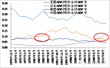人民币国际化处在相对较好的时期。第一,人民币国际化处在美元上升周期,成本相对较小。1985年后,日本政府极力推动日元国际化,同期美元处在下降周期,造成日元对美元大幅升值,导致出口部门压力剧升,经济增速从5.1%下降到3%。第二,中国经济总量和贸易额占全球的比重已经达到日元或德国马克当年进行国际化时的水平。2013年,中国经济规模和对外出口占全球的份额均为12%,超过日元和马克国际化时日本和德国的经济规模、出口份额,为5-10%。