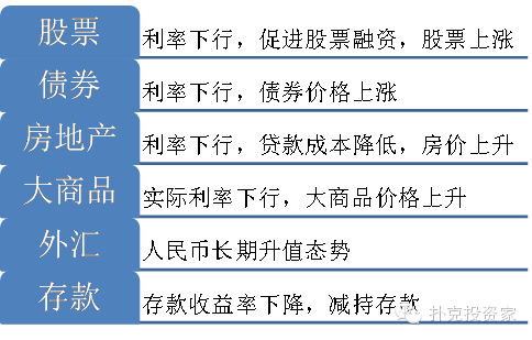人民币国际化背景下,利率下降,导致居民大类资产配置发生变动:从储蓄到资本市场产品。总体来讲,随着人民币国际化,资本账户逐渐开放,利率市场化的推进,最终存在利率下行的趋势。利率下降,分母驱动包括股票、债券、房地产等资产价值上升,资产配置从储蓄向资本市场倾斜。