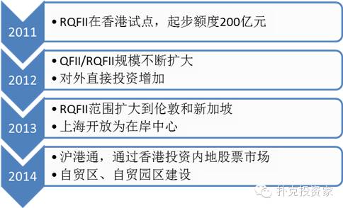 中国于2011年推出RQFII项目。此举旨在推动人民币国际化,提升人民币在国际融资和贸易中的地位。RQFII试点范围已经从最初的香港扩大到新加坡、英国、法国、韩国、德国、卡塔尔、加拿大、澳大利亚等国家。2014年RQFII投资额度高达将近3000亿,远远超出了2011年的人民币200亿元。