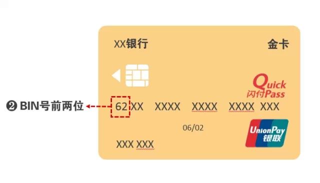 其中BIN号“62”打头的为银联卡,“4”打头的为VISA卡,“5”打头的为万事达卡,“35”打头的为JCB卡,“37”打头的为美国运通卡。所以在银联开展的很多优惠活动中会要求使用“62”开头的银行卡。