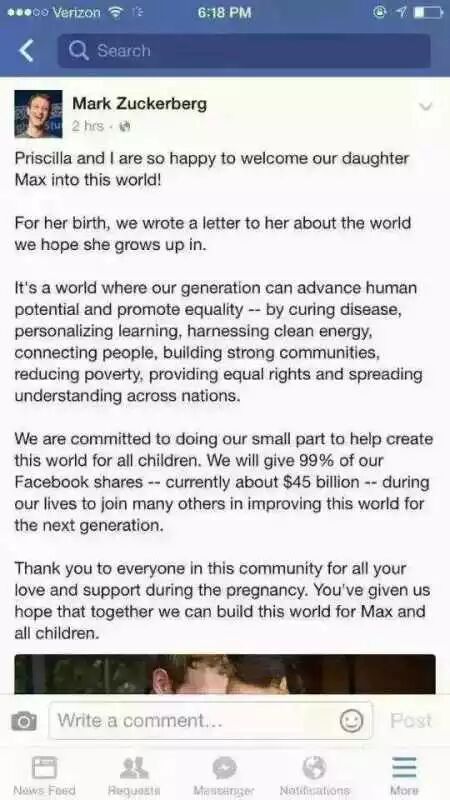 12月1日,社交网络巨子、脸书公司CEO马克·扎克伯格宣布,成功晋级成为一名爸爸,并给自己的女儿送上一份独特的礼物:捐出在Facebook公司99%股份,目前市值约450亿美元。 他成立了以自己及太太姓氏为名的基金会“Chan Zuckerberg”,旨在提倡平等及儿童权益,为女儿、也为全世界的孩子打造一个更美好的世界。