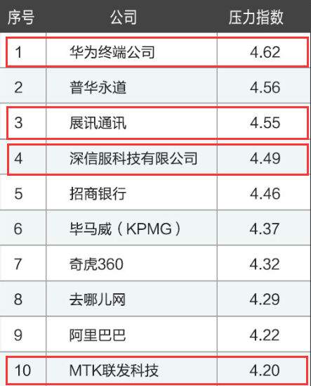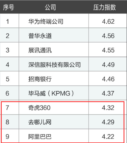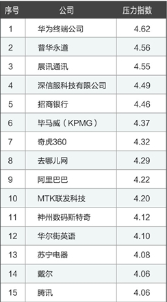 前不久,南方都市报的一则报导让2015年的4月蒙上了一层灰色,36岁的清华硕士IT男猝死在加班酒店的马桶上,死前一天还跟妈妈说太累了。这则新闻让人又开始关注“工作压力”、“过劳死”等一系列职场健康问题。 我们根据企业员工匿名填写的百万条公司点评数据,从压力指数出发,梳理出了排名在前30名的压力最大的公司。一起看看哪些行业压力大,哪些公司最容易过劳? 如图,TOP30压力指数最高的公司中,IT/互联网、电子通讯、金融三大行业压力最大。 排名第一的是华为终端公司,小编的一个朋友就在华为,也常常抱怨加班是常态,有时候甚至到半夜12点还没回家。反应到数据上,压力指数4.62,果然华为员工压力都很大。 奇虎360,去哪儿网和阿里巴巴分别名列压力最大公司的第7名到第9名,站在消费者的立场,这3家公司出了小编日常最常用的几个产品,比如360杀毒软件,去哪儿客户端订机票,天猫买东西,而站在员工的立场,这3家却是压力最大的公司。 四大是很多人的梦想,在四大工作一度被人们艳羡,但是四大也因为过劳一度被推上风口浪尖,排名第二的普华永道在2011年4月就有过一次交大25岁美女硕士员工过劳死的风波,此次压力榜上有名也在意料之中。毕马威也是四大之一,此次压力排行榜名列第6位。 华为,展讯,深信服及台湾企业MTK四家公司进入了TOP10,四家都是电子通讯公司,在前10名中占了近一半。该行业的压力程度可见一斑。 此次压力TOP30的企业中,共有4家银行上榜,分别为招商银行第4位,中国银行第21位,建行第26位,工行第30位。 在此呼吁大家,工作忙碌的同时,还是要注意自己的身体,远离过劳和压力过大,职场人士在找工作的时候,也务必要看准了再跳槽。 附压力排行榜TOP30供参考: