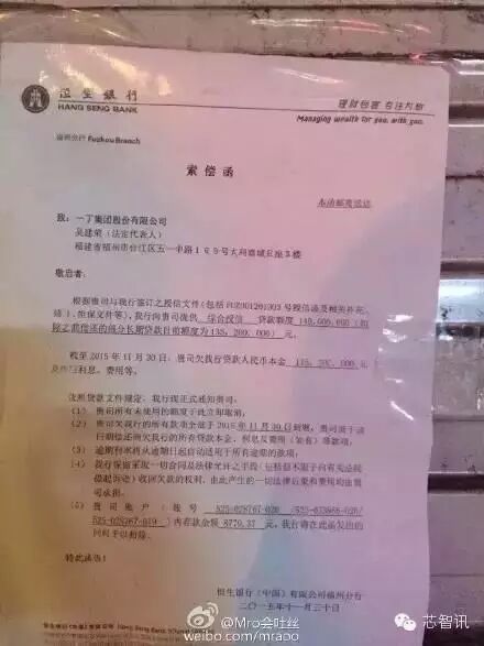 据了解,目前一丁的门店基本上都关闭了。而且福州的部分门店上还张贴着恒生银行(中国)有限公司福州分行发出的索偿函。