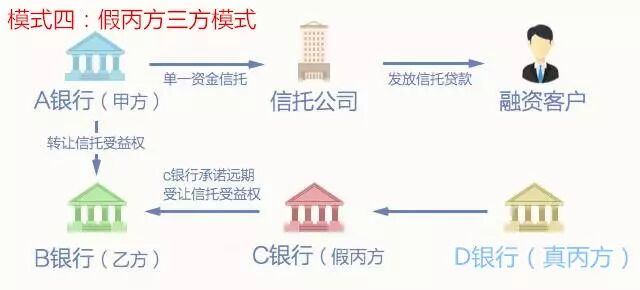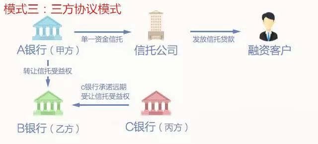 这种模式的实质是C银行通过B银行的的资金,间接实现了给自己的授信客户贷款的目的。此种操作模式下,信托受益权的流转路径是从A银行(甲方)到B银行(乙方),然后远期再到C银行(丙方)。