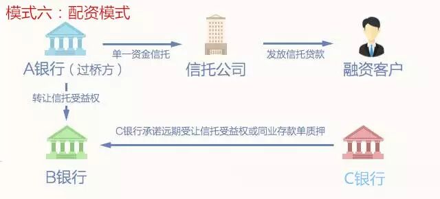 这种模式的交易结构是:C银行向B银行配一笔等期限等额的同业存款,B银行通过桥方A银行以对应金额和期限向融资客户发放一笔信托贷款,C银行承诺远期受让B银行的信托受益权,或者不受让。如果C银行受让B银行的信托受益权,C银行的同业存款就是标准的同业存款,因为针对融资客户信托贷款的风险已经转移给C银行;如果不受让信托受益权,就需要对该笔同款业务进行存单质押,锁定B银行贷款给融资客户的风险,或者出函单独说明该笔同业存款是对应某一笔信托贷款的,当信托贷款不能偿付时,同业存款不用兑付。