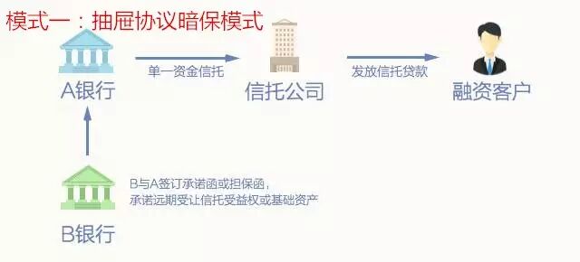 抽屉协议暗保模式是最简单、最基础的操作模式,通常是B银行由于信贷额度或贷款政策限制,无法直接给自己的融资客户贷款时,找来一家A银行,让A银行用自己的资金设立单一信托为企业融资。这种模式下,B银行作为风险的真正兜底方,与A签订承诺函或担保函(暗保),承诺远期受让A银行持有的单一信托受益权或者基础资产。这里B银行有两种兜底方式,一种是B银行出资受让信托受益权,另一种是B银行直接收购针对融资客户的基础资产。