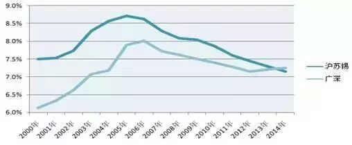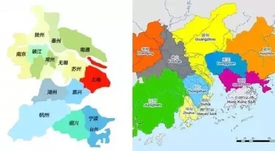 2.三个城市的面积和人口与珠江三角洲四座城市大致相当。统计数据显示,在2014年,“沪苏锡”的面积为19616.63平方公里,常住人口为4134.79万人;“广深”经济带的面积为15693.57平方公里,常住人口为3955.31万人。从人口和面积来看,这两个地区具有可比较性。