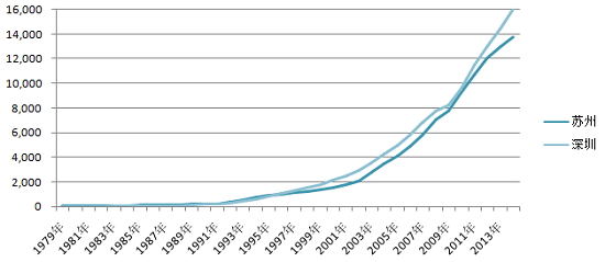 图2:苏州和深圳的地区生产总值(亿元)(数据来源:国家统计局)
