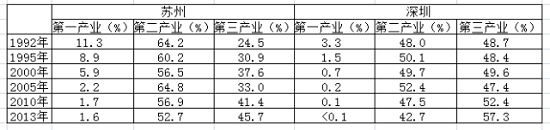 表2:苏州与深圳的产业结构对比(数据来源:国家统计局)