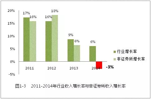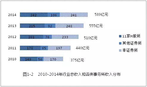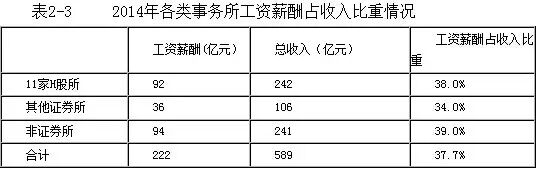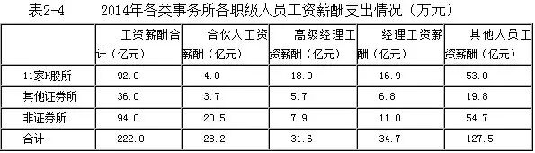 2014年,全行业支出工资薪酬约222亿元,比2010年的135亿元增加了87亿元,年均增长率约为 13%,超过行业收入年均增长率。如表2-3所示,2014年,11家H股所工资薪酬支出约92亿元,占其业务收入的38.0%,其他证券所工资薪酬支出约36亿元,占其业务收入的34.0%,非证券所工资薪酬支出约94亿元,占其业务收入的39.0%。行业总工资薪酬与总收入的比重为37.7%。