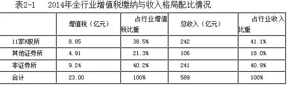 根据表2-1进一步分析增值税缴纳情况,11家H股所缴纳增值税约8.85亿元,占行业增值税纳税总额的38.5%,其他证券所缴纳增值税约4.91亿元,占比为21.3%,非证券所缴纳增值税约9.24亿元,占比为40.2%,增值税纳税情况与行业收入格局基本匹配。