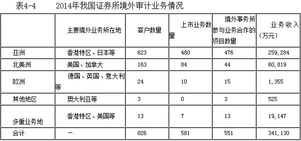 近年来,财政部持续推进会计审计准则国际趋同等效,积极参与国内外、多双边会计服务市场开放磋商,推动大中型会计师事务所国际化发展,同时采取多种措施加强跨境审计监管。2015年5月,财政部印发《会计师事务所从事中国内地企业境外上市审计业务暂行规定》(财会﹝2015﹞9号),将会计师事务所从事中国内地企业境外上市审计业务行为纳入监管范围。报备数据显示,目前开展境外审计业务的事务所主要为证券所,业务情况如表4-4所示。从境外审计项目所在地看,绝大部分位于亚洲和北美(占比约95%),且集中在香港特区和美国。多重业务地的审计项目较少,但审计收入较高,主要原因是多地上市的公司多为大型企业,如中石油、中国联通等。