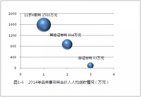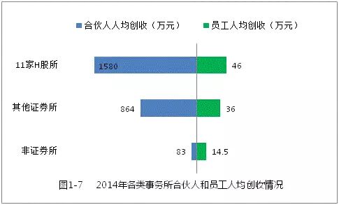 进一步分析显示,在各事务所内部,合伙人人均创收与员工人均创收呈正相关关系,即合伙人人均创收高的事务所,员工人均创收也较高。如图1-7和表1-4所示,11家H股所内部,这一比率约为34倍;在其他证券所内部,这一比率为24倍;在非证券所内部,这一比率约为6倍。从全行业看,平均比率约为8倍。