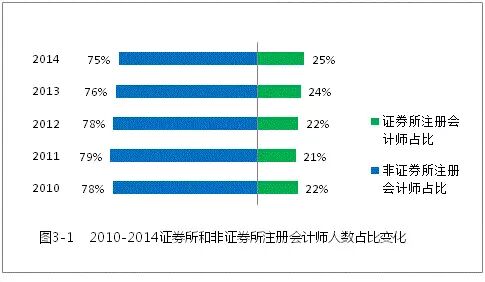 图3-1数据显示,约25%的注册会计师集中在40家证券资格会计师事务所中,平均每家证券所的注册会计师人数超过600人。总体看,证券所的注册会计师人数占比小幅上升,非证券所的注册会计师人数占比略有下降,注册会计师小幅缓慢向证券所集中的趋势逐步显现。