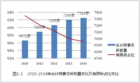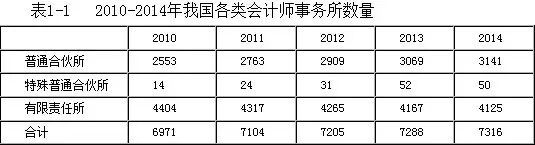截至2014年12月31日,中国注册会计师行业共有会计师事务所7316家,其中普通合伙会计师事务所3141家,特殊普通合伙会计师事务所50家[2],有限责任事务所4125家。另有会计师事务所在境内设立的分所984家。