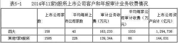 如表5-1数据所示,2014年度“四大”共拥有上市公司年报审计客户158家,平均每所拥有上市公司客户40家,与其他7家H股所平均拥有226家上市公司客户相比,“四大”的上市公司客户数量并不占优。但是,“四大”平均每家上市公司客户的年报审计收费为1033万元,是其他7家H股所上市公司年报审计户均收费水平的近12倍。从上市公司资产角度分析,A股市场上市公司约86%的资产经“四大”审计,表明“四大”大客户集中的优势仍较显著。