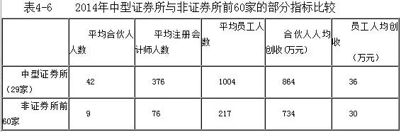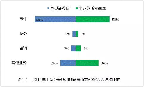 为了观察除11家从事H股审计的大型事务所之外的其他29家中型证券所与排名靠前的60家非证券所的有关差异,我们就部分指标做了对比分析。如表4-6和图4-1所示,中型证券所在合伙人和注册会计师规模上明显高于非证券所前60家,但在合伙人人均创收、员工人均创收和收入结构方面差异不大。这表明规模较大的非证券所的服务能力得到市场认可,逐步创造条件使之拥有更多市场机会是合理的、可行的。