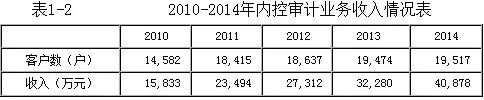 据下表(表1-2)进一步分析,2010-2014年,我国会计师事务所的内控审计客户数量和业务收入呈快速增长趋势,收入年均增幅约27%,内控审计成为我国注册会计师行业最为闪亮的新业务增长点之一。内控审计业务的快速发展,与财政部等五部委制定发布《企业内部控制基本规范》(财会〔2008〕7号)和《企业内部控制配套指引》有较大关联。上市公司内部控制审计制度和自我评价制度已基本建立,实施范围不断拓展至中央企业、金融机构等,这为会计师事务所开拓内控审计和咨询业务提供了强有力政策支持。