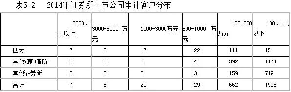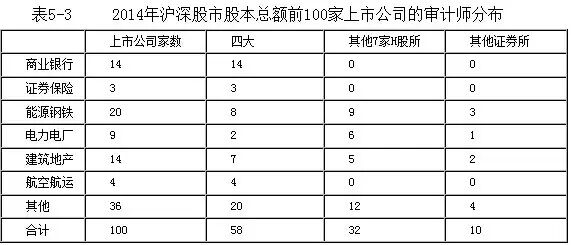 从审计收费进一步观察客户分布(见表5-2),审计收费在3000万元以上的12家上市公司全部为“四大”的客户;审计收费在500-3000万元的客户中,“四大”占据了近80%。从上市公司客户行业分布角度看(见表5-3),“四大”在银行、证券、保险、航空航运等领域仍具有绝对优势。