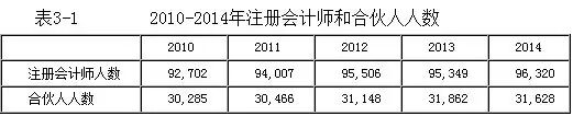如表3-1所示,截至2014年12月31日,全行业共有执业注册会计师96,320人,合伙人31,628人。数据显示,从2010至2014年,执业注册会计师增加了3618人,合伙人增加了1343人,均呈小幅增长之势。