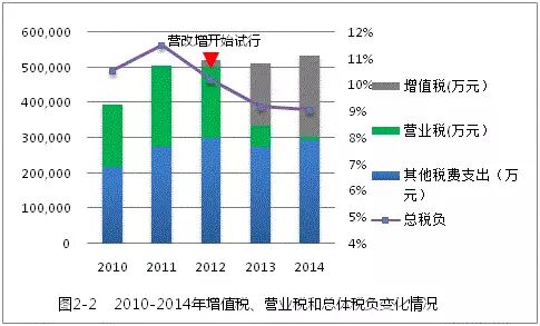 由于注册会计师行业是典型的知识密集型专业服务行业,可抵扣的增值税进项税额较少,因此,业内人士一度担忧“营改增”改革可能对行业税负造成不利影响。我们对2010-2014年全行业增值税、营业税和总体税负变化情况作了分析。图2-2和表2-2显示,自国务院决定于2012年实施“营改增”以来,全行业总体税负呈逐年下降趋势,从10.20%下降到9.05%,这说明“营改增”改革总体上对行业减负和行业发展产生了积极影响。