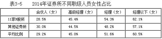 以证券所为样本进一步分析(见表3-5),2014年度证券所整体从业人员达到8.2万人(含合伙人、注册会计师和其他从业人员),男女比例约为3:4,女性超过“半边天”,但是在合伙人层级,男女比例为5:2,说明在证券业务领域,女性注册会计师晋升合伙人的提升空间仍较大。