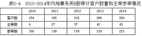 2010年12月,经与香港特区有关方面达成协议,财政部、证监会联合推荐了12家内地事务所从事H股企业审计业务(中瑞岳华和国富浩华于2012年合并为瑞华,现有11家H股所),标志着H股双重审计政策彻底取消。如图5-1和表5-4所示,内地所获许从事H股审计业务以来,客户数量平稳增长,主审(由内地所出具审计报告)比例有所提升,2014年内地事务所的H股审计收入约为22.5亿元。从项目分布看,“四大”仍然占据主导地位,在2014年度的264家H股客户中,“四大”的客户为232家,占比约88%;取得审计收入约21.8亿元,占比约97%。但从主审比例来看,内地其他7家H股所的主审比例更高,在其32家客户中,主审客户为20家,占比62.5%,而内地“四大”主审的客户比例约为其H股审计客户总数的10%。尤其值得一提的是,2015年3月,天健会计师事务所第一次以中国执业注册会计师身份、依据内地审计准则签发按照内地会计准则编制的H股财务报表审计报告,标志着内地会计师事务所从事H股审计不断向纵深发展。
