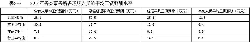 由表2-5进一步分析,全行业合伙人平均工资薪酬为8.9万元,高级经理平均工资薪酬为22.5万元,经理平均工资薪酬为14.2万元,其他人员平均工资薪酬为7.0万元。由于合伙人以分红为主要收入来源,因此平均工资薪酬较低属正常现象。对不同类型事务所工资薪酬支出作横向比较,数据显示,11家H股所的高级经理及以下人员平均工资薪酬明显高于其他证券所,证券所从业人员平均工资薪酬明显高于非证券所。当然,此为全行业总体情况,具体到各事务所之间仍存在一定差异。