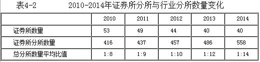表4-2数据显示,2010-2014年,证券所的数量呈逐年下降趋势,从2010年的53家逐渐减少至2014年的40家,这是行业遵循市场规律,优化重组、强强联合的结果。与此同时,证券所分所数量不断增加,从2010年的416家增长到2014年的558家,平均每家证券所拥有14家分所,基本构建了覆盖全国主要城市尤其是发达地区和战略要地的服务网络。