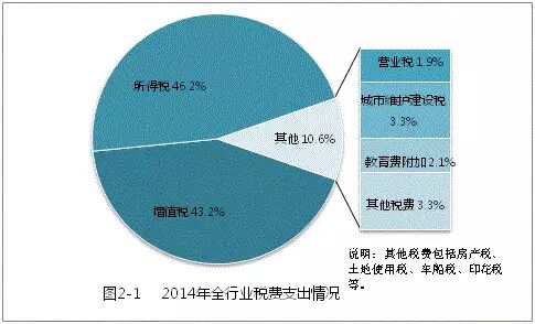 2014年度全行业合计支出税费[7]约53.3亿元,其中所得税[8]约24.6亿元,占比46.2%,增值税约23亿元,占比43.2%。各项税费占比情况如图2-1所示。