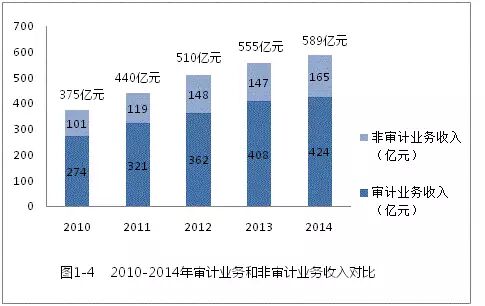 图1-4数据显示,一方面,审计业务依然是我国会计师事务所的主要收入来源,占比约72%;另一方面,非审计业务收入增长提速,从2010年的101亿元增长到2014年的165亿元,年均增长率约13%,高于行业收入年均增长率(12%),表明会计师事务所拓展业务范围、加快多元化发展取得良好成效。